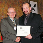 Frank McTighe presents Jack Murphy with his CCNA Silver Quill award for 25 years of service or longer in the weekly newspaper business on September 17, 2006.