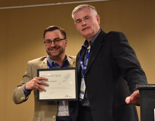 Brian Bachynski presented with CCNA's Silver Quill award by Duff Jamison of Great West Newspapers